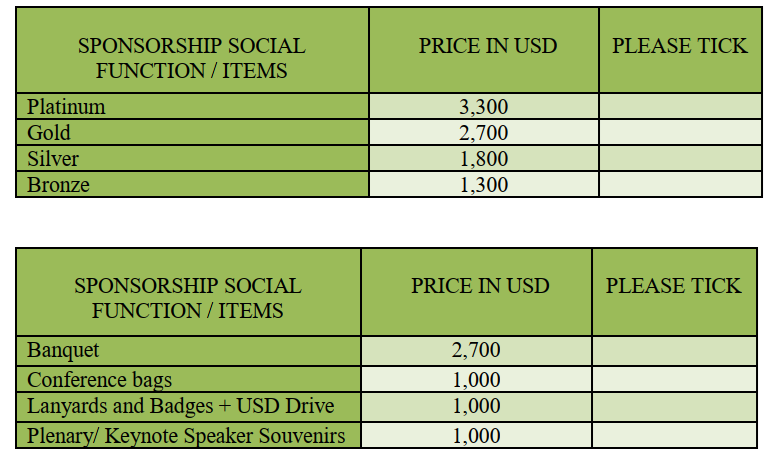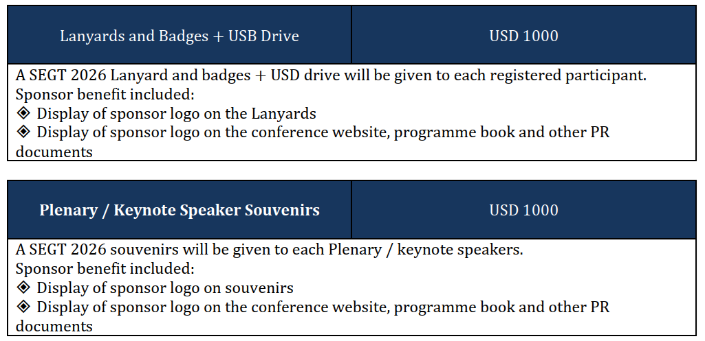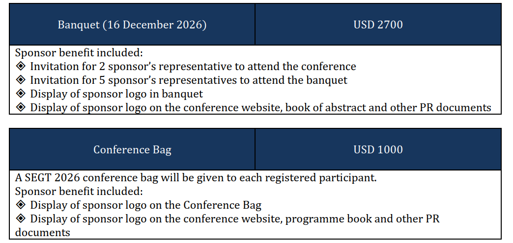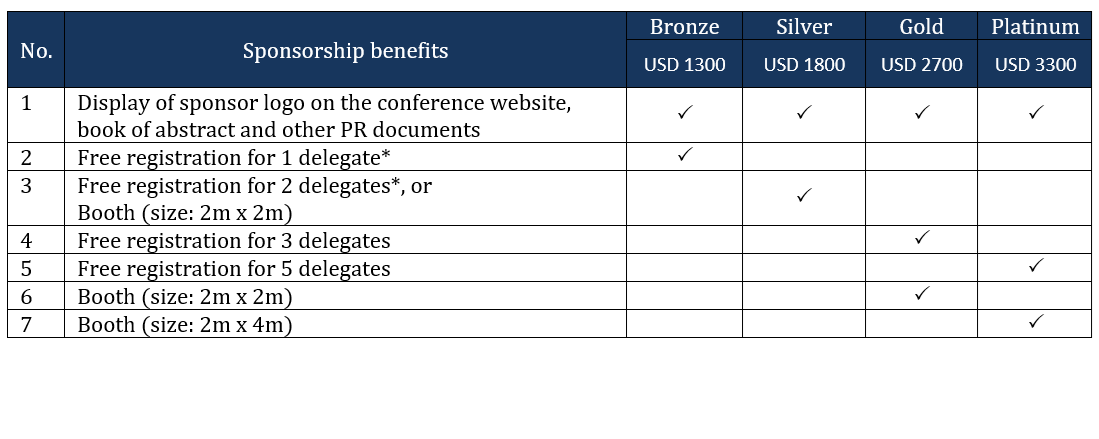 *Delegate supported by the sponsorship will have access to all technical sessions, receive all conference materials (including book of abstract, E-Book of proceedings, etc.), and all meals (including coffee-breaks and luncheons).
