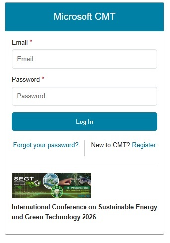 will find further instructions. Please log-in the MS-CMT and select the correct conference, International Conference on Sustainable Energy and Green Technology 2026 (SEGT 2026) – Joint conference in the CMT Online System.